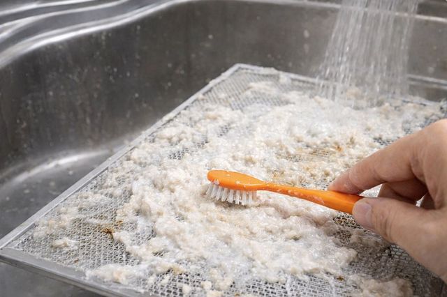 시간이 지나면 칫솔을 준비해 반죽이 발린 표면을 살살 문질러 준다. 칫솔은 모가 촘촘해 후드 필터의 망 사이, 모서리 틈 같은 세밀한 부분을 닦기에 유용하다. 힘을 과하게 주기보다는 원을 그리듯이 부드럽게 문질러 기름때가 반죽과 함께 뭉쳐 나오도록 하는 것이 핵심이다.