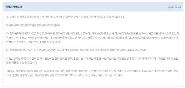 하지만 최근 국민권익위원회 청탁금지제도과에 접수된 한 고등학생의 질의에 대한 답변은 결이 다르다.