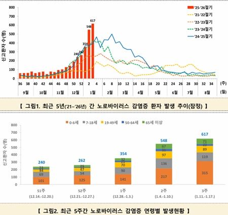 최근 5주간 발생 추이를 보면 2025년 12월 3주 240명에서 12월 4주 262명, 2026년 1월 1주 354명, 1월 2주 548명, 1월 3주 617명으로 증가했다.
