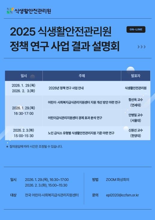 설명회는 총 2회차에 나눠 진행된다. 오는 29일(목)에는 ▲2026년 식생활안전원 정책 연구 사업 안내(유아의 건강식생활실천 설문조사, 건강취약계층 실태조사 등)를 시작으로 ▲어린이·사회복지급식관리지원센터 지원 개선 방안 마련 연구(연세대 함선옥 교수) ▲어린이급식관리지원센터 경제 효과 분석 연구(서울대 안병일 교수) 결과 보고가 이어진다.