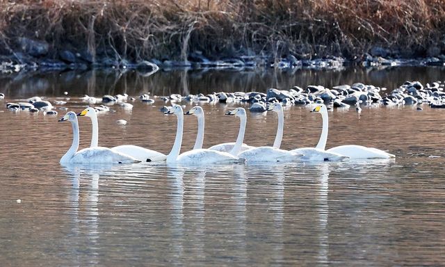 강추위가 계속되고 있는 충북 괴산군 달천강에서 멸종위기 야생생물 2급이자 천연기념물인 큰고니 7마리가 발견돼 화제다.