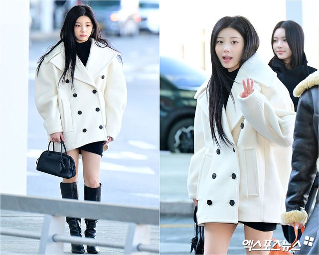 이날 아일릿 원희는 화이트 더블 코트에 코트 안 블랙 컬러의 하이넥 톱과 미니 원피스를 매치해 전체적인 균형을 잡았다. 여기에 블랙 롱부츠를 신어 슬림한 레그 라인을 강조하면서도 클래식한 분위기를 유지했다.