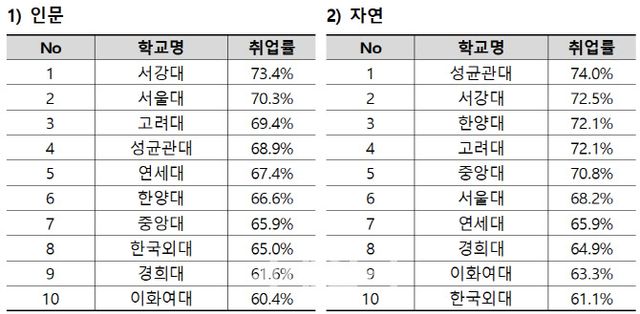 인문계열에선 서강대가 73.4%로 가장 높았으며 서울대(70.3%)·고려대(69.4%)·성균관대(68.9%)·연세대(67.4%)·한양대(66.6%)·중앙대(65.9%)가 뒤를 이었다. 교육부·국가데이터처·한국교육개발원가 작년 12월 발표한 2024년도 고등교육기관 졸업자 취업통계조사에서는 전국 일반대학 졸업자 평균 취업률이 62.8%로 집계됐다.