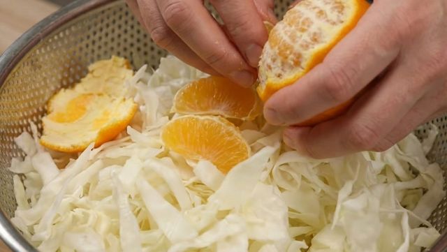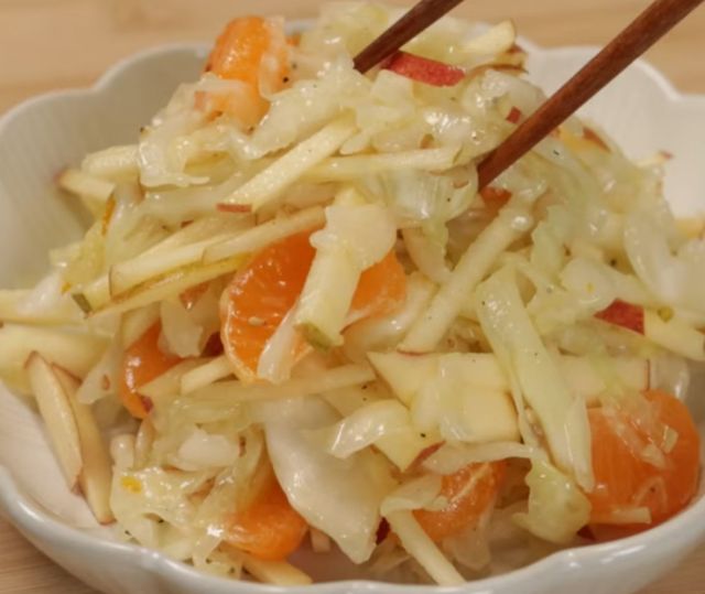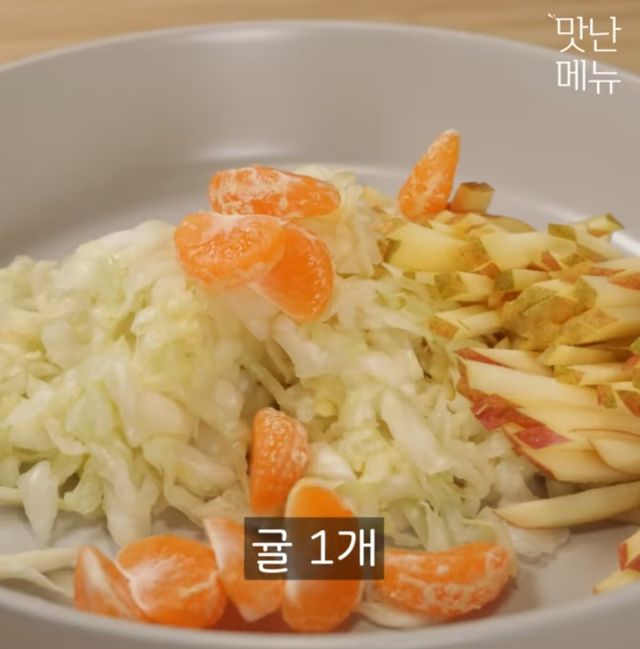 유튜브 '맛난 메뉴'에 따르면, 양배추 200g에 소금 1작은술을 넣은 후 잘 버무려 준다. 그리고 꽉 짜면서 물기를 빼준다. 이후 사과 반 개를 잘게 잘라 양배추 위에 얹어준 후 그 위에는 귤 1개를 까서 넣는다.