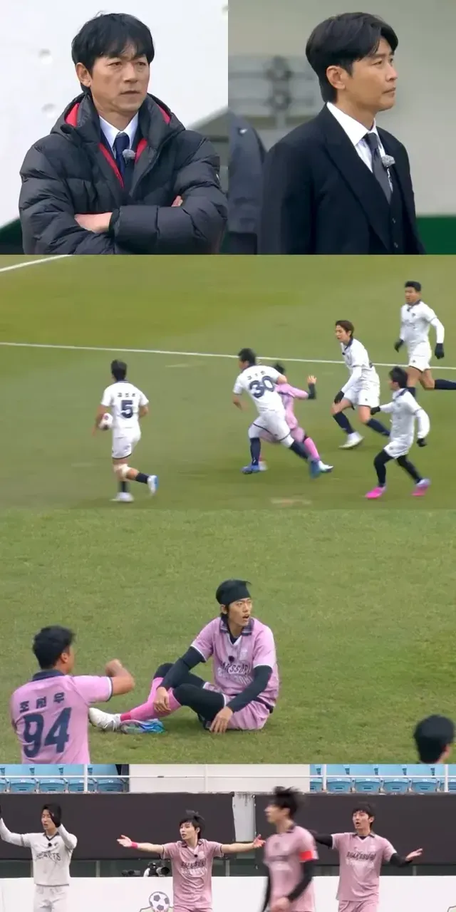 경기장 안에서는 한 치의 양보도 없는 처절한 승부가 펼쳐졌다. 양 팀 선수들은 파이널 진출을 위해 몸을 아끼지 않고 격렬하게 부딪치며 매 순간 사력을 다했다. 거친 몸싸움과 숨 막히는 공방이 쉴 새 없이 이어지며 벤치의 긴장감은 극에 달했다. 김남일 감독은 판정과 경기 흐름에 격앙된 듯 분노의 샤우팅을 쏟아내며 강한 불만을 표출했다. 반면 이동국 감독은 연이은 위기 상황에 깊은 한숨을 내쉬는 모습이 포착되며, 예측 불가능한 경기 전개를 예고했다. 두 감독의 상반된 반응은 경기의 치열함을 여실히 드러냈다.