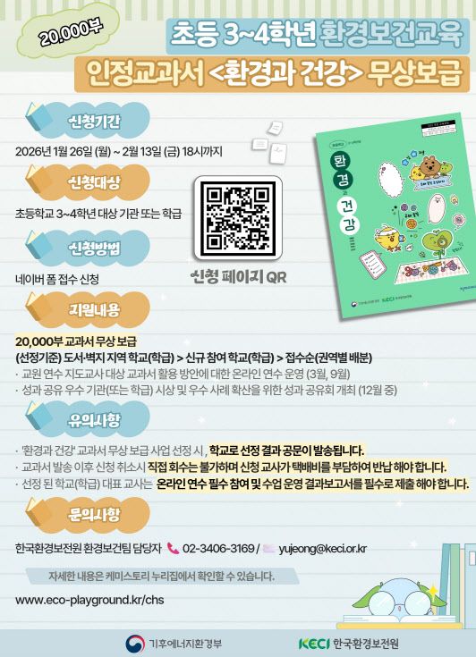 기후에너지환경부와 한국환경보전원은 25일 학교 현장의 환경보건교육 활성화를 위해 초등학교 3~4학년용 인정교과서인 ‘환경과 건강’ 무상 보급 사업을 추진한다고 밝혔다.