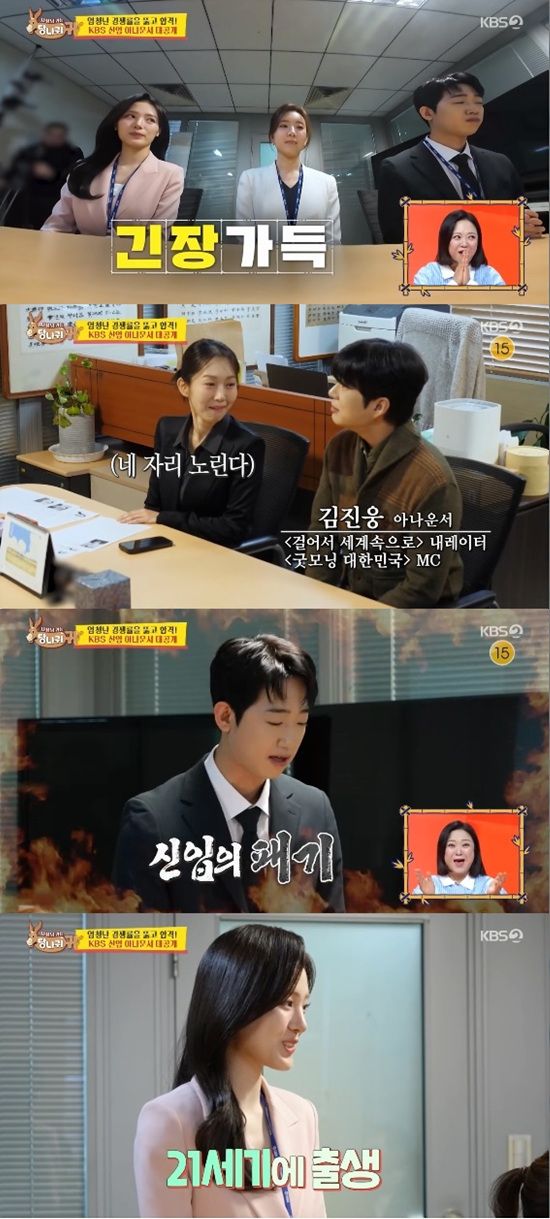 그때 김진웅이 51기 신입 아나운서들을 데리고 등장했다. 엄지인은 51기 아나운서들에 대해 3년 만에 뽑은 신입들로 천 명 넘게 지원해서 선발된 3명이라고 설명했다.