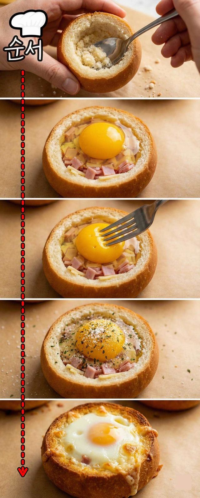 이 조리법의 핵심은 모닝빵이다. 이미 속이 부드럽고 수분이 적당해 계란을 담기에 적합하다. 모닝빵 윗부분을 칼로 얇게 도려내거나 숟가락으로 꾹 눌러 홈을 만든다. 바닥이 뚫리지 않게만 주의하면 된다. 이 공간이 계란과 토핑을 담는 그릇 역할을 한다.