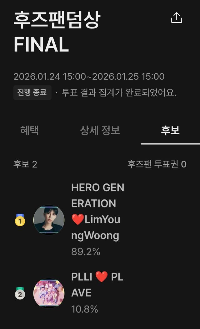 가수 임영웅과 팬덤 영웅시대는 글로벌 K-팝 팬덤 플랫폼 후즈팬(Whosfan)에서 진행된 ‘33주년 한터뮤직어워즈 2025’ 후즈팬덤상 투표에서 최종 1위를 차지했다. 이번 투표에서 임영웅은 준결승에서 방탄소년단 팬덤 아미를 꺾고 결승에 진출한 뒤, 결승에서는 PLAVE의 팬덤 PLLI를 득표율 89.2%라는 큰 차이로 제치며 정상에 올랐다.