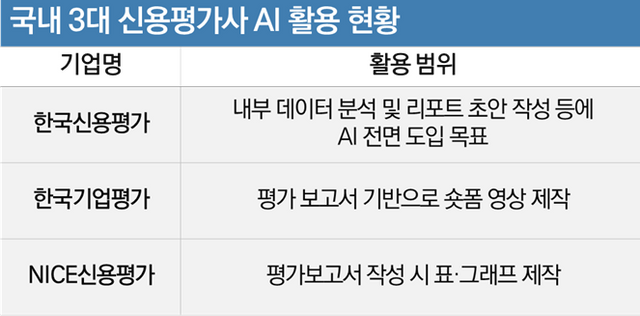 한국기업평가와 NICE신용평가는 AI에 있어선 아직 초기 단계의 실험적 접근을 이어가고 있다. 한기평은 AI를 활용해 정보 전달 방식을 다각화하고 있다. 최근 텍스트 중심의 딱딱한 평가 보고서를 AI를 이용해 숏폼 영상으로 제작, 유튜브 등 소셜 미디어를 통해 배포하고 있다. 복잡한 신용 등급 변동 사유나 산업 전망을 시각화된 영상으로 제공함으로써 기관 투자자뿐만 아니라 일반 투자자들과의 쌍방향 커뮤니케이션을 강화하겠다는 전략이다.