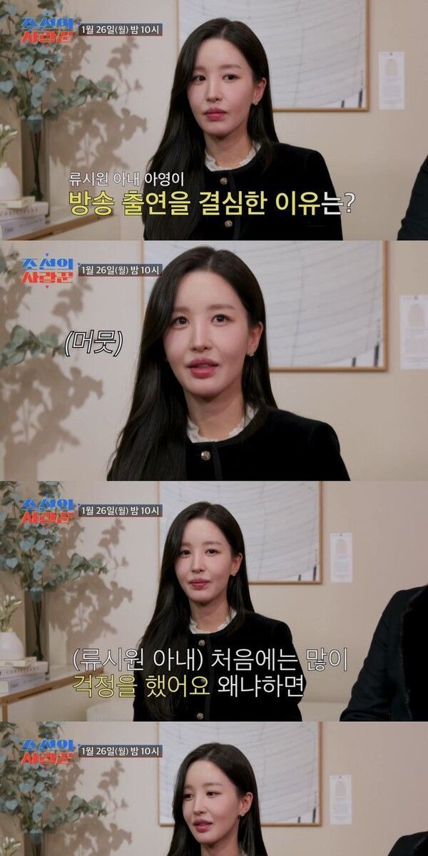 류시원의 아내는 "이전에도 남편이 방송에 나가면 사람들의 반응에 저도 모르게 신경을 쓰게 됐다"고 속내를 털어놓는다.