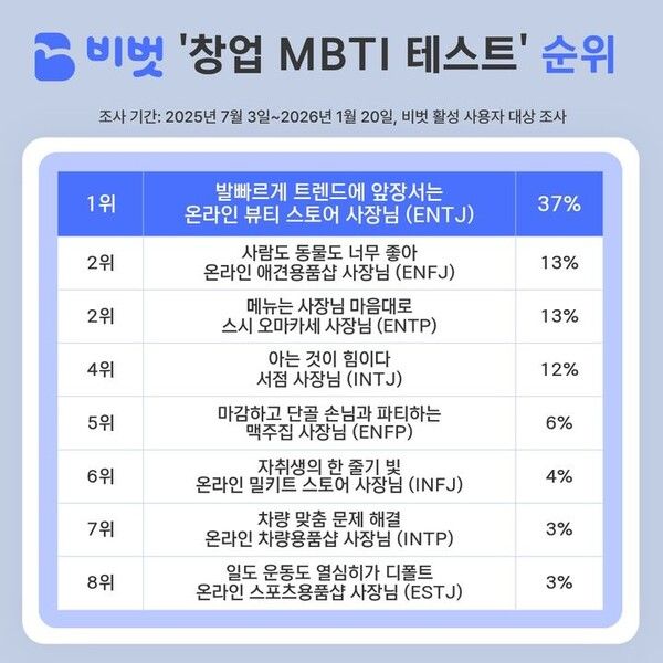 회사 측에 따르면 이번 조사는 최근 약 6개월(지난해 7월 3일~올해 1월 20월) 동안 비벗 앱 내에서 '창업 MBTI 테스트'에 참여한 사용자들의 테스트 결과를 분석해 이뤄졌다.