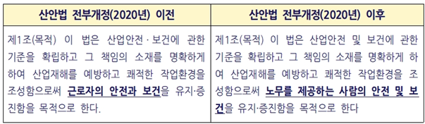 2020년에 이뤄진 산안법 전부개정은 사실 특별한 의미를 갖고 있었다. 독특하게도 법의 제1조 '목적' 조항을 바꾼 것이다. 종전에 '근로자의 안전 및 보건'이라고 명시된 부분을 '노무를 제공하는 사람의 안전 및 보건'으로 개정해 굉장히 포괄적인 보호대상을 설정한 것이다. (아래 표 참조)