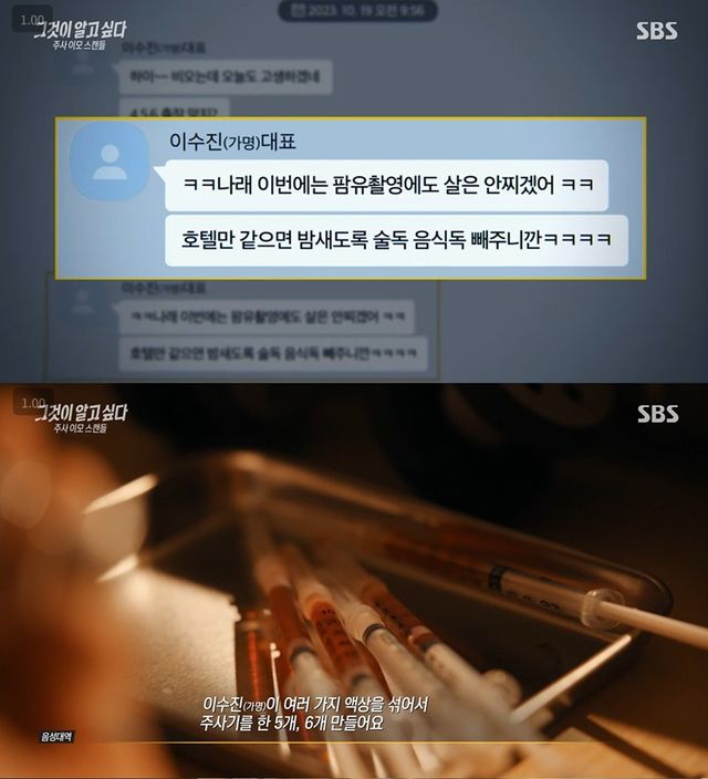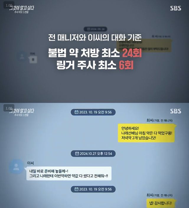 '그알'에 따르면 전 매니저 A씨의 메신저 대화에만 담긴 불법 의료 행위는 약 처방 24회, 링거 주사 6회로 최소 30회에 달한다.