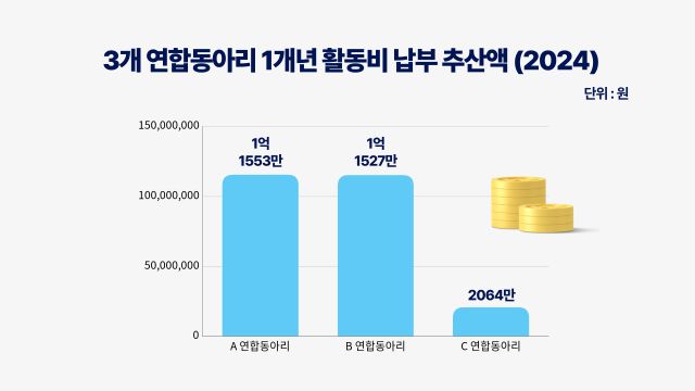 해당 내용을 토대로 계산한 결과 A 연합동아리는 지난해 약 1억1553만 원, B 연합동아리는 1억1527만 원, C 연합동아리는 2064만 원의 활동비를 누적한 것으로 보인다. 홈페이지를 통해 정확한 휴식 인원 파악이 어려워 휴식비 산출을 제외했음에도 3개 연합동아리를 합쳐 2억5000만 원이 넘는 활동비 누적액이 발생한 것으로 추산된다.