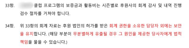 또한 '34항'에서는 회계 관련 사항에 대해 후원 법인의 허가를 받은 회계 권한을 소유한 담당자 외에는 보안을 유지해야 하며 관련 내용이 무분별하게 유출될 경우 당사자에게 법적 책임을 묻겠다고 명시했다. 1인당 52~67만 원에 이르는 연합동아리 활동비를 후원사가 정한 연합동아리 내 담당자가 회계하고, 그 감사를 동일한 후원사에서 진행하는 구조나 다름없다.