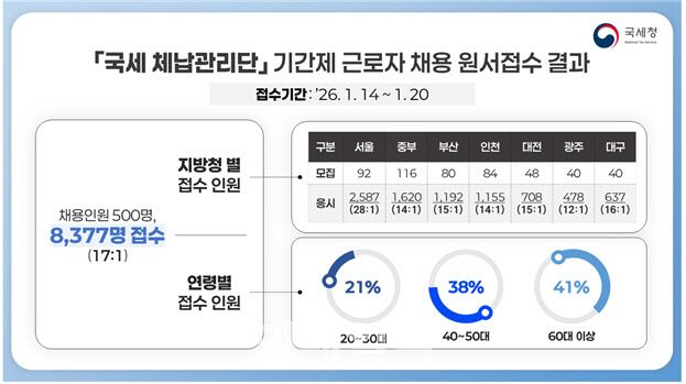 26일 국세청이 발표한 ‘2026년 국세행정 운영방안’에 따르면 오는 3월 정식 출범하는 국세 체납관리단 실태확인원 모집 결과 500명(전화 125명·방문 375명) 선발에 총 8377명이 지원해 17대 1 이상의 경쟁률을 기록했다.