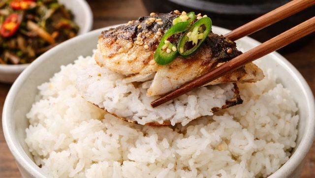 쌀 밥 위에 고등어 살을 얹은 사진(AI로 제작됨)