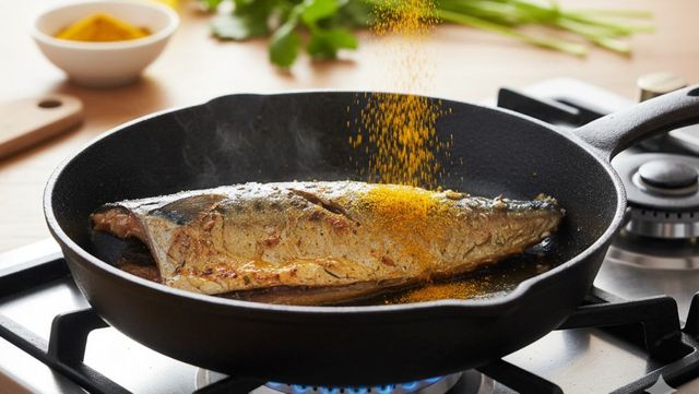 고등어에 카레가루를 뿌리는 모습 (AI로 제작됨)