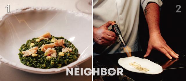 1 셰프가 재배한 수생식물과 플랑크톤을 활용한 ‘플랑크톤 라이스’. 3 시그너처 디시 ‘마린 베이컨’. 서비스 직전 토치로 겉면을 익혀 지방을 녹인다.