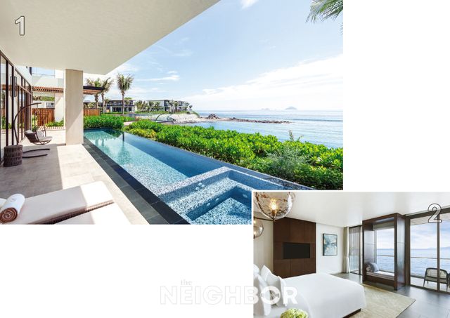 1 바다가 내다보이는 그란 오션 빌라의 프라이빗 풀. 2 그란 오션 빌라의 마스터 베드룸 내부.