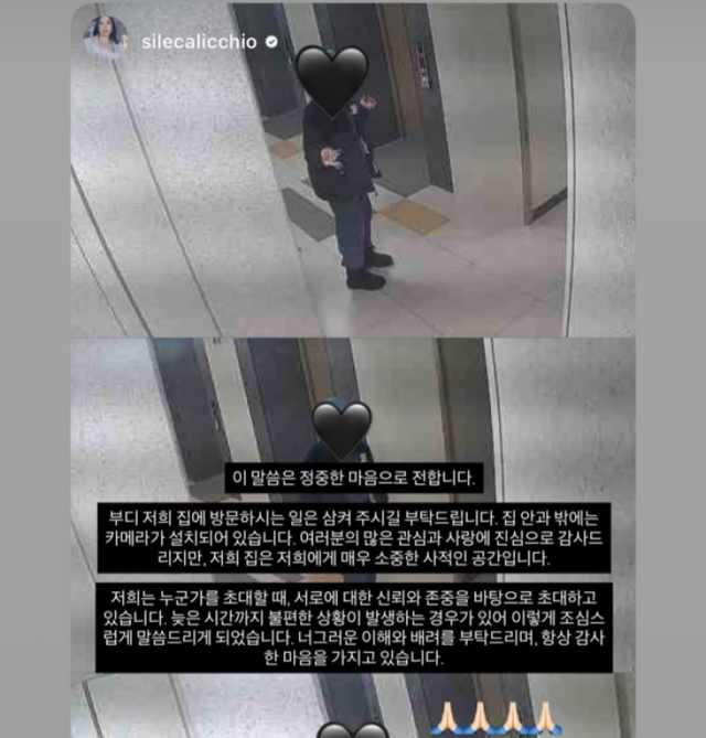 그러면서 칼리키오는 '여러분의 많은 관심과 사랑에 진심으로 감사드린다. 하지만 집은 우리 (가족)에게 매우 소중한 사적인 공간'이라며 '우리는 누군가를 (집에) 초대할 때 서로에 대한 신뢰와 존중을 바탕으로 한다. 늦은 시간까지 불편한 상황이 발생하는 경우가 있어 이렇게 조심스럽게 말씀드린다. 너그러운 이해와 배려를 부탁드린다'며 뜻밖의 불청객에 불편한 기색을 내비쳤다.