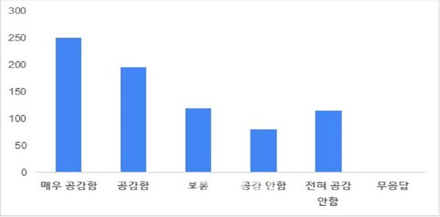 반면 공감하지 않는다는 의견은 25.6%로 나타났다. 공감하지 않는다가 10.5%(80명), 전혀 공감하지 않는다가 15.1%(115명)다.