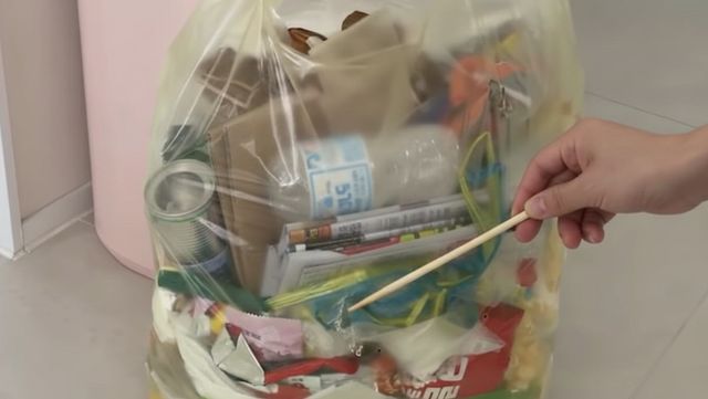 종량제 봉투 하단을 젓가락으로 찔러 공간을 확보한다 (AI로 제작됨)