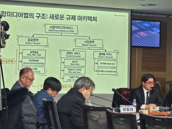 또 다른 발제자인 권오상 디지털미래연구소 대표는 "현행 법체계에서 가장 포지티브 규제(법에서 나열된 것만 허용)인 광고와 편성을 네거티브 규제(금지된 것 외 모두 허용)로 전환하려고 한다"며 "동일한 기능을 한다면 동일 규제를 받고, 서비스 중심으로 시청각미디어 개념을 정립한 게 핵심"이라고 말했다.
