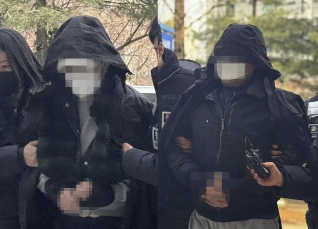 이날 오후 2시께 법원에 모습을 드러낸 이들은 모자와 마스크로 얼굴을 가린 채 수갑을 찬 손을 가리개로 덮고 취재진 앞에 섰다.