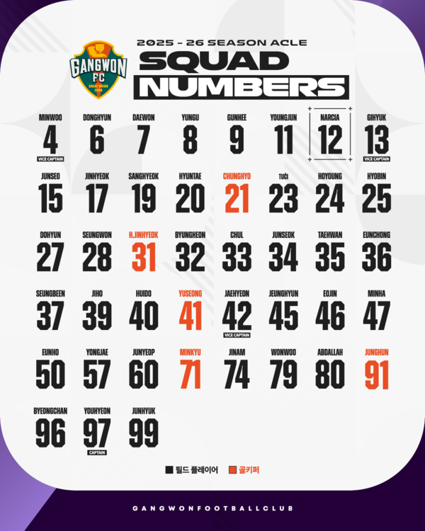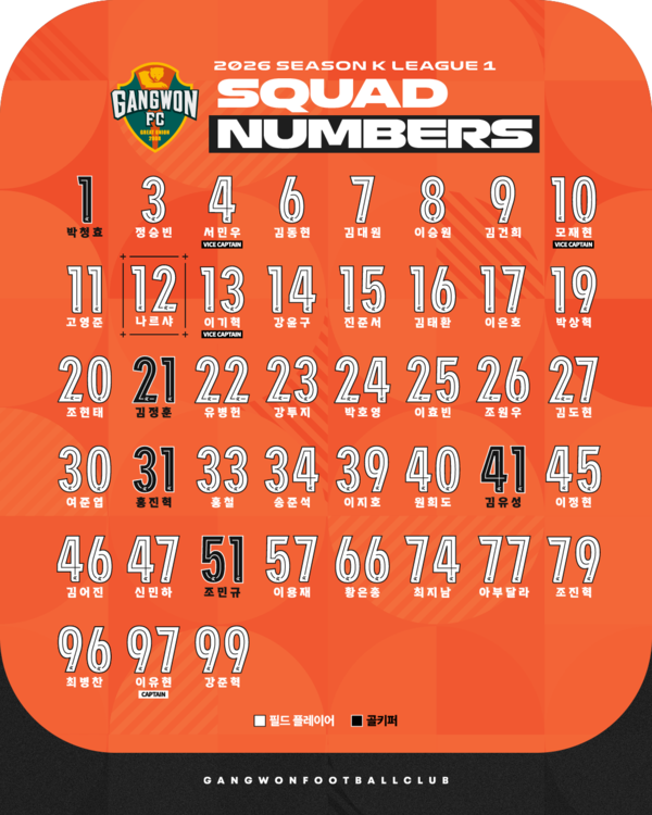 [풋볼리스트] 김희준 기자= 강원FC가 2026시즌 등번호를 공개했다.