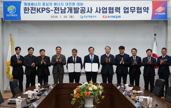 뉴시스 보도에 따르면, 한전KPS는 26일 전남개발공사와 재생에너지 중심의 에너지 대전환 대비를 위한 업무협약을 맺었다고 밝혔다.