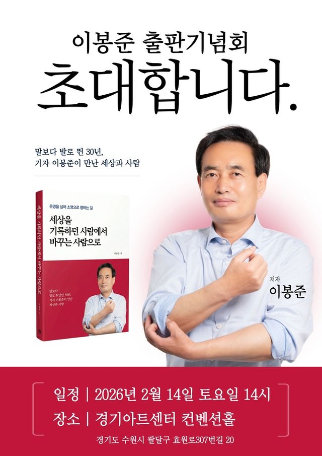 [와이뉴스] 국민의힘 수원시갑 이봉준 당협위원장이 오는 2026년 2월 14일(토) 오후 2시, 경기아트센터 컨벤션홀에서 출판기념회를 개최한다고 밝혔다.