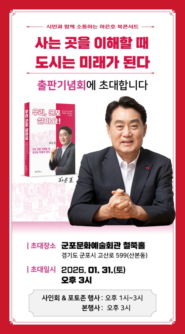 [와이뉴스] 하은호 군포시장이 저서 '우리 군포살아요' 출판을 기념하는 북콘서트를 오는 1월 31일 오후 3시 군포문화예술회관에서 연다고 밝혔다.