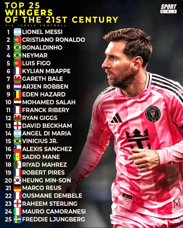 영국의 스포츠 매체 '스포츠 바이블'은 최근 21세기에 최고의 활약을 펼친 25명의 윙어들을 선정해 공개했다. 여러 포지션을 소화했더라도 주 포지션이 측면 공격수였던 선수들만 이 명단에 올라갈 수 있었다.
