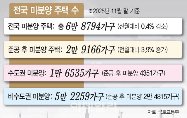 국토부가 매입 범위 확대를 검토하는 배경에는 지방 미분양 적체가 심화하고 있다는 현실 인식이 깔렸다. 국토부 주택 통계에 따르면 지난해 11월 말 기준 전국 미분양 주택은 6만 8794호로 전월보다 소폭 줄었지만, 준공 후 미분양은 2만 9166호로 오히려 늘었다. 이 가운데 85.1%가 비수도권에 집중돼 있다.