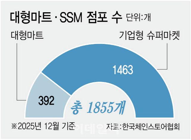 대체 가능성이 높은 건 대형마트와 SSM이다. 새벽배송 규제가 풀리기만 해도 대형마트 3사와 SSM 4사의 전국 1800여개 점포가 ‘도심형 물류거점’으로 활용될 수 있다. 체인스토어협회에 따르면 지난해 12월 기준 대형마트 3사 점포는 392개, SSM 점포는 1463개로 총 1855개에 달한다. 현재 쿠팡의 풀필먼트센터(FC)와 중간 거점 캠프가 약 200곳임을 감안하면 9배 이상의 물류 인프라가 이미 준비된 상황이다.