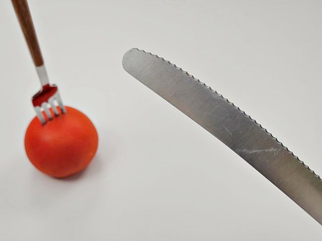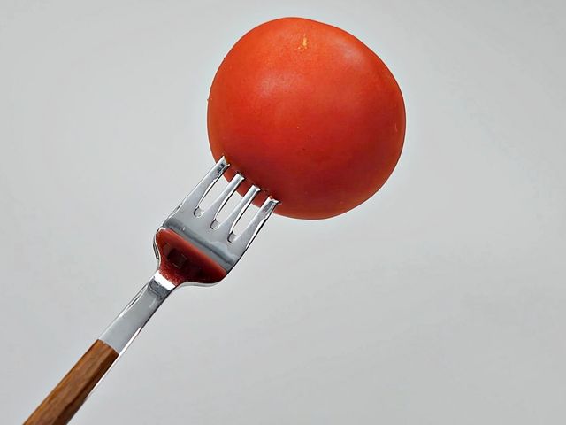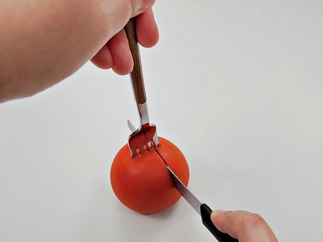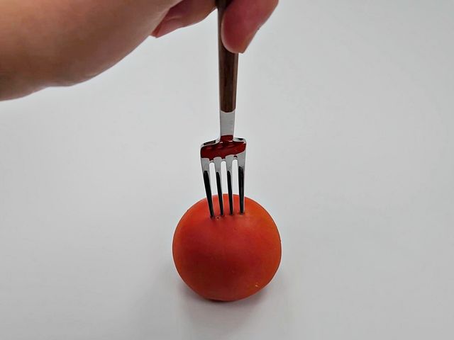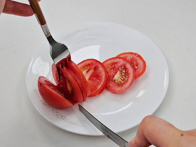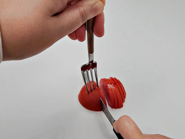 토마토를 포크로 고정해서 안 미끄러지고