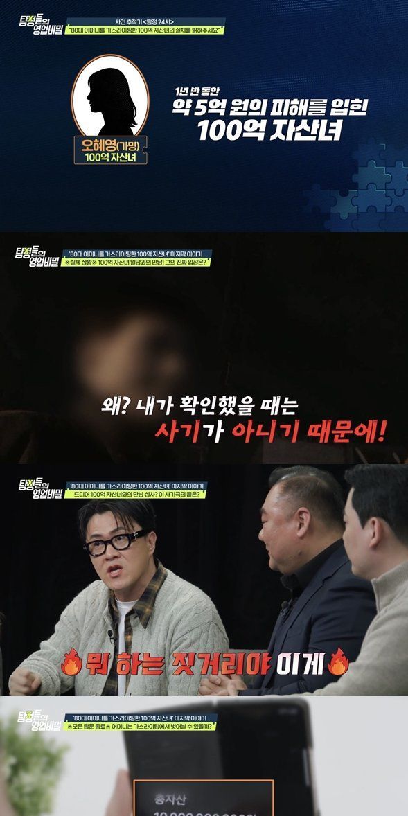 100억 자산녀 일당의 또 다른 인물인 강성혜(가명)의 남편은 “아내가 억대의 돈을 들고 집을 나갔다”고 증언해 충격을 더했다. 또 그녀가 아들의 명의를 도용해 연대보증인으로 세웠다는 사실도 드러났다. 모든 탐문이 종료되고, 백호 탐정단은 의뢰인의 어머니를 만나 모든 진실을 전했다. “100억 자산녀는 평창동에 산 적이 없고, 마지막 주소지는 고시텔이었다. 아버지가 H건설 사장·어머니가 갤러리 관장이라는 것과, M대학교 출신이라는 학력 역시 허위였다”는 탐정단의 이야기에 한동안 말을 잇지 못했다. 또한 의뢰인의 어머니가 그들을 믿을 수밖에 없었던 결정적 이유인 ‘100억 통장’ 역시 손쉽게 조작이 가능하다는 것을 직접 보여줬다. 그제서야 1년 반 넘게 지속된 가스라이팅의 실체를 마주한 의뢰인의 어머니는 “사람인데 어떻게 그런 짓을 할 수 있냐”며 무너져내렸다. 결국 의뢰인은 그동안 모은 자료들을 토대로 100억 자산녀와 일당을 고발했다.