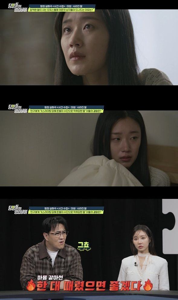 조사 결과, 의뢰인의 딸은 친구에게 가스라이팅을 당해 돈벌이 수단으로 성매매에 이용되고 있었다. 고등학생 시절, 어머니를 잃은 상실감과 외로움에 빠졌던 의뢰인의 딸은 ‘신기(神氣)’가 있다는 친구의 말을 맹신하게 됐다. 그 맹신은 통제를 넘어 범죄로 이어졌다. 친구는 “네가 가진 살기 때문에 가족들이 죽을 수도 있다”며 공포를 조장했고, “이를 막기 위해 치성을 드려야 한다”며 거액을 가지고 가출하도록 조종했다. 나아가 “살기를 빼려면 신이 점지해 준 깨끗한 남자들과 관계를 맺어야 한다”며 성매매까지 강요했다. 데프콘은 “욕이 나오는데 방송이라 할 수가 없다”며 울분을 터뜨렸고, 일일 탐정으로 함께한 한그루는 “한 대 때렸으면 좋겠다”며 격분했다. 결국 친구는 강요·협박·성매매 알선 등의 혐의로 처벌을 받았고, 의뢰인의 딸은 가스라이팅에서 벗어나 가족의 품으로 돌아갔다.
