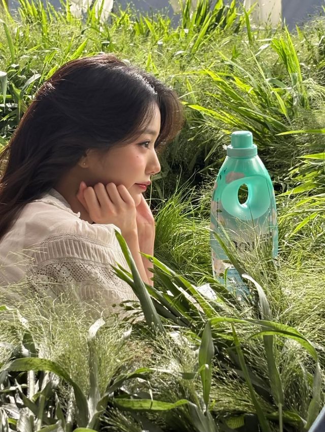 특히 장원영은 풀숲 사이에서 두 손으로 턱을 괸 채 정면을 응시하거나, 제품을 바라보는 듯한 포즈로 내추럴한 매력을 강조했다. 촬영 소품으로 놓인 섬유유연제 제품과 어우러진 민트빛 색감은 청량하면서도 깨끗한 이미지를 극대화하며 광고 콘셉트를 직관적으로 전달한다.