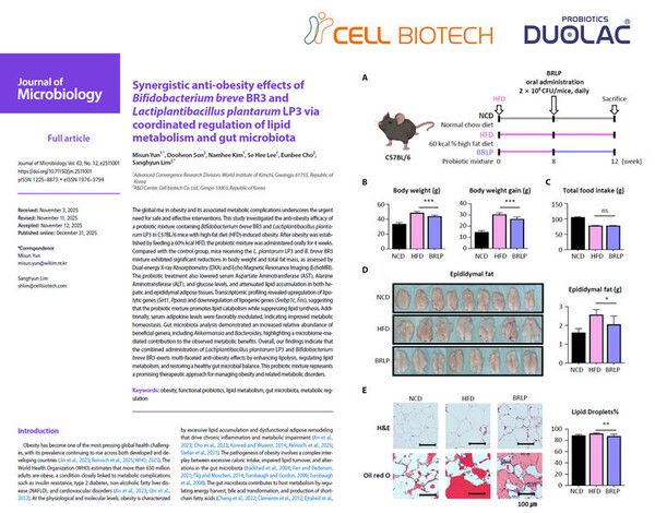 쎌바이오텍 R&D센터 관계자는 "이번 연구는 듀오락 CBT 유산균이 장내 미생물 환경 개선을 기반으로 체지방 감소와 대사 기능 개선에 기여할 수 있음을 과학적으로 입증한 사례"라며 "약물 중심 치료의 한계를 보완할 수 있는 안전하고 지속 가능한 비만 관리 전략으로서 마이크로바이옴 기반 솔루션의 가능성을 제시했다는 점에서 의미가 크다"고 말했다.