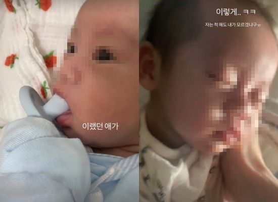 영상 속에는 두 눈을 동그랗게 뜬 채 쪽쪽이를 물고 있는 아기의 모습이 담겨 있다. 이어진 영상에는 잠에 든 듯 눈을 감고 있는 아기의 사랑스러운 자태가 눈길을 끈다. 엄마를 닮은 또렷한 이목구비가 훈훈함을 자아낸다.