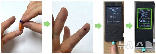 지금까지 칼륨 측정은 병원을 방문해 정맥혈을 채혈하고 대형 장비로 분석해야만 가능했기 때문에 많은 시간이 필요했다. 당뇨 환자가 집에서 쉽게 사용 가능한 혈당계처럼 칼륨을 언제 어디서나 스스로 짧은 시간 안에 재는 것은 기술적으로 어려움이 많았다.