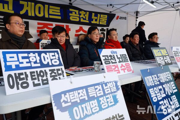 뉴시스 보도에 따르면, 국민의힘은 27일 통일교·공천 뇌물 쌍특검 수용을 촉구하고자 국회 본청 앞에서 무기한 릴레이 천막 농성에 돌입했다.