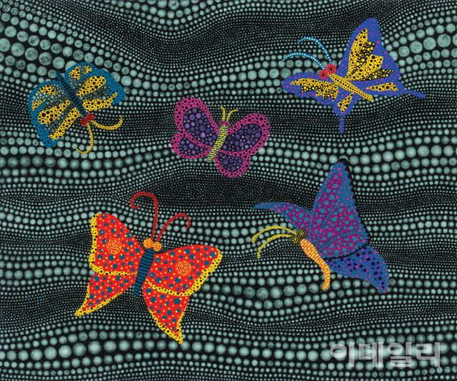케이옥션은 쿠사마에 집중했다. 원화 2점과 판화 3점 등 5점을 내거는데. 이제껏 봐온 쿠사마 작품과 결이 다른 한 점은 ‘드레스’(Dress 1982, 22.5×154.5㎝)다. 도록 표지로 소개하기도 한 이 작품은 특유의 ‘그물망 무한 증식’으로 호박도 나비도 아닌 앙증맞은 드레스 형상을 빚어 시선을 끈다. 주황색 옷걸이에 걸린 초록 칼라의 붉은 드레스란 다채로운 색감으로도 여느 작품과는 확연히 다르다. 추정가는 5억∼8억원. 또 한 점의 원화인 나비그림 ‘버터플라이 ‘TWAO’’(2004, 38×45.5㎝)는 호박에 찍던 도트 패턴을 바닥에 깔고 그 위에 알록달록한 나비를 올렸다. 시작가 10억원부터 호가를 높여가며 응찰자를 미혹할 예정이다.