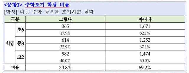 설문 결과 ‘나는 수학을 포기하고 싶다’고 응답한 학생은 전체 학생 응답자 중 30.8%를 차지하는 것으로 조사됐다. 특히 학년별로 응답 비율이 높아졌다. 초6의 경우 17.5%인 반면 중3은 32.9%로, 고2는 40%로 뛰었다.