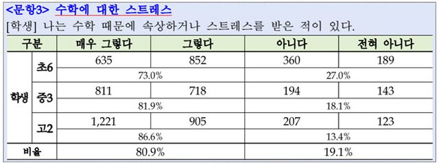 아울러 학생 10명 중 8명은 수학 때문에 스트레스를 받는 것으로 나타났다. 학생 응답자 중 80.9%는 수학에 대한 스트레스를 받은 적이 있다고 답했다. 구체적으로는 초6은 73%였고 중3 81.9%, 고2 86.6%로 집계됐다.