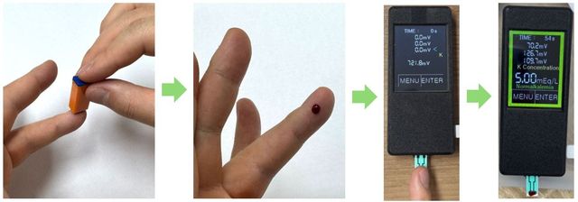 연구팀은 손가락 끝을 가볍게 찔러 나온 소량의 모세혈을 일회용 검사지에 떨어뜨려 수십 초 안에 칼륨 수치를 측정하는 검사기기를 연구에 사용했다. 혈당측정기와 비슷한 이 검사도구를 말기콩팥병으로 혈액투석을 받는 환자 40명을 대상으로 유효성을 확인했다.