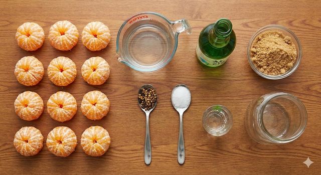 귤 피클 만들기에 필요한 재료들. 귤, 물, 소주, 식초, 황설탕, 소금, 피클링 스파이스 / AI 생성 이미지